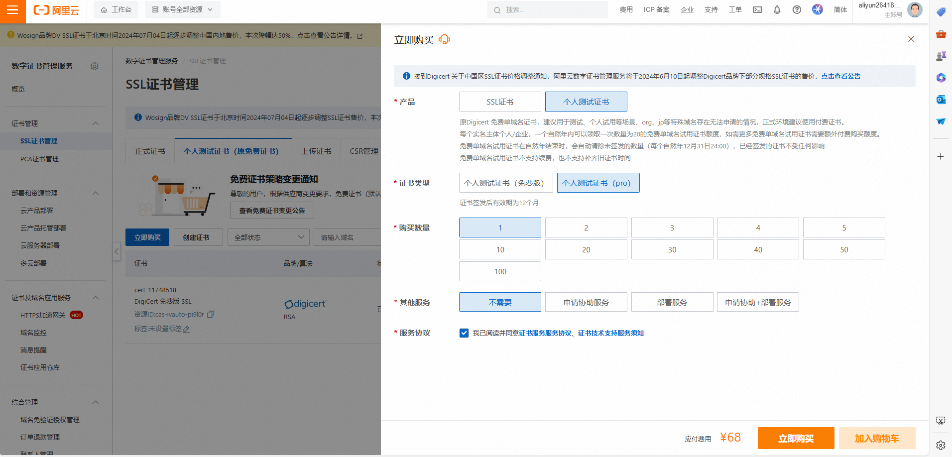 2、SSL证书控制台-SSL证书资源包-立即购买,按截图选择个人测试证书(原免费证书)