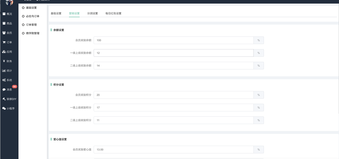 支持设置余额、积分、消费积分、爱心值奖励比例,包括:会员奖励、会员一级上级奖励、会员二级上级奖励。