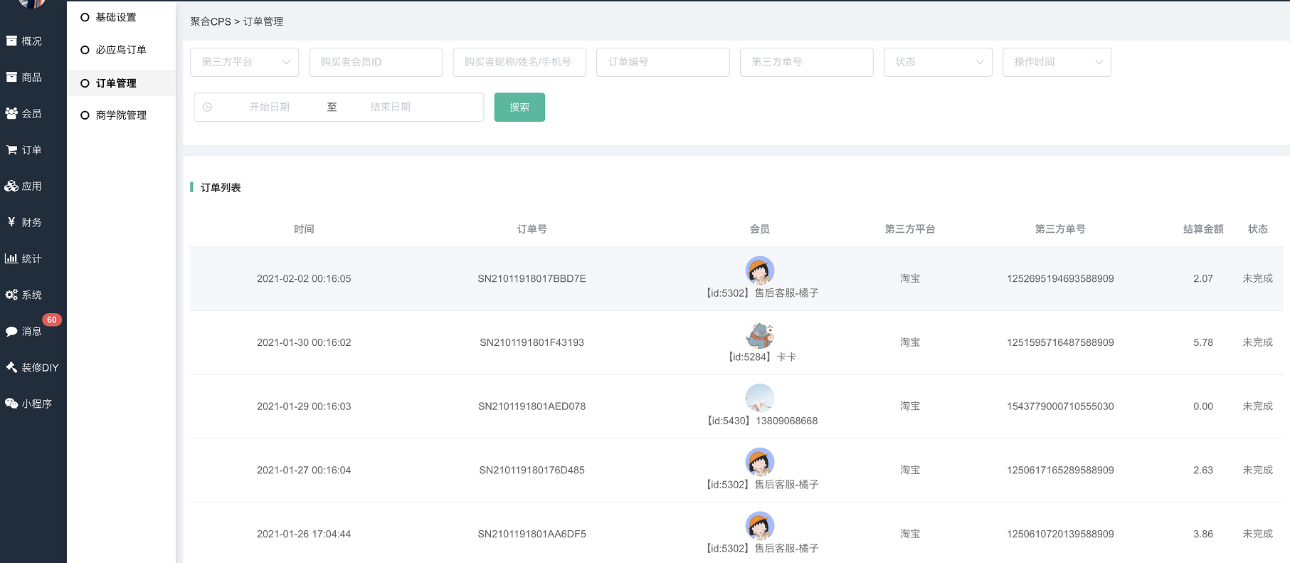同步聚合CPS接口平台产生的所有订单信息。